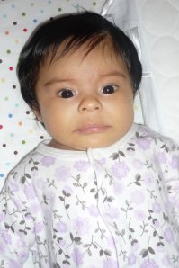 Here is a picture of Isabela right after bath time. Thats why she looks so sad. She hates bath time! Anyhow, its also the only time that her hair lays flat on her head. She looks like such a different baby without all that crazy hair! (: